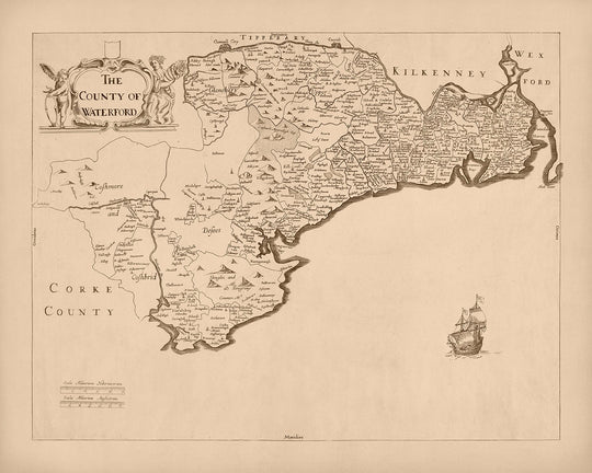 Questa mappa della Contea di Waterford, pubblicata nel 1685 da Sir William Petty, è una mappa politica e fisica dettagliata che fornisce una ricchezza di informazioni sulla regione. La mappa si basa sul Down Survey of Ireland, che è stata la prima mappatura dettagliata della terra su scala nazionale in qualsiasi parte del mondo. La mappa di Petty mostra strade, ponti, città, luoghi, diocesi e arcidiocesi che erano presenti alla fine del XVII secolo in Irlanda. Anche colline, foreste, fiumi, laghi e loughs sono mostrati in modo pittorico.