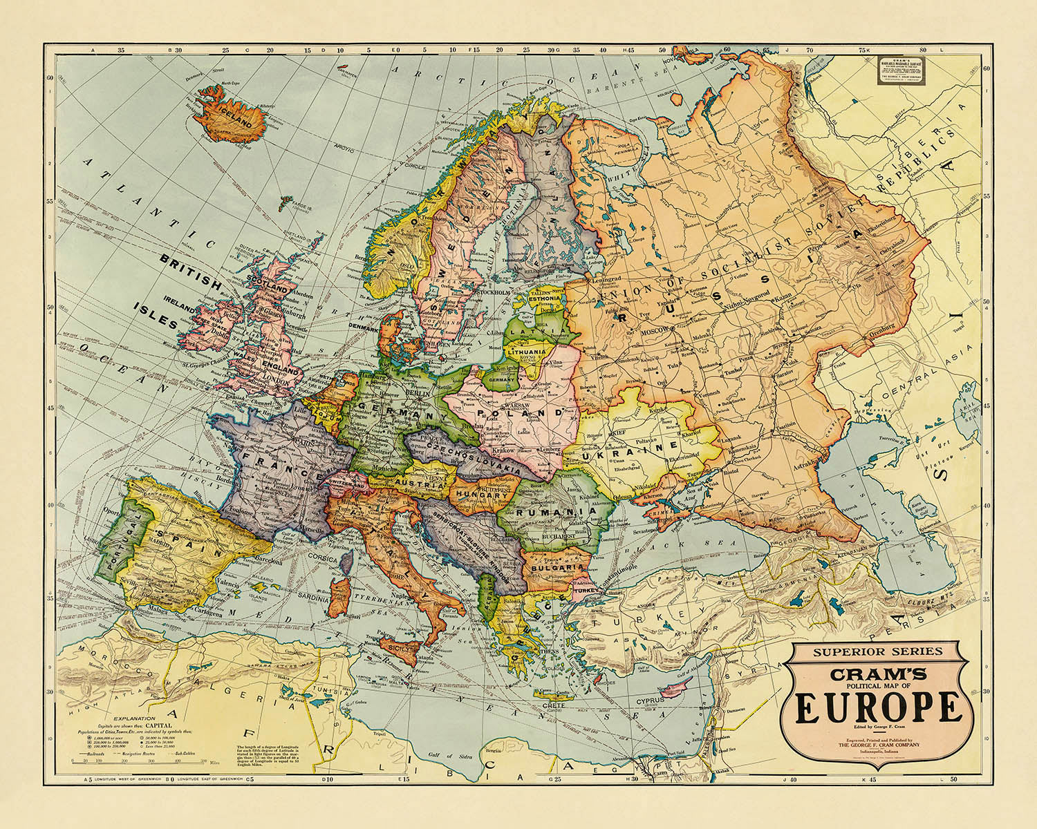 Cram's Political Map of Europe, Superior Series, published in 1925 by George Franklin Cram and The George F. Cram Company of Indianapolis, presents Europe at a moment of intense geographic redefinition with the sure-handed clarity that made Cram a mainstay of American cartography. Conceived for the classroom yet composed with a collector’s eye, it distills a complex continent into a lucid, color-keyed portrait of nations and regions. The map’s confident typography, clean graticule, and elegant cartouches elevate pedagogy into design, while its crisp delineation of borders invites close study of a landscape newly reordered after the Great War. It is a document of knowledge in motion—balanced, bright, and immediately intelligible—capturing the optimism of educational innovation in the early twentieth century.