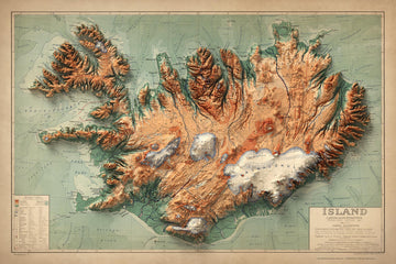 La mappa mostra praticamente tutte le città, i villaggi, le montagne, i fiumi, le baie, i vulcani e i ghiacciai dell'Islanda.