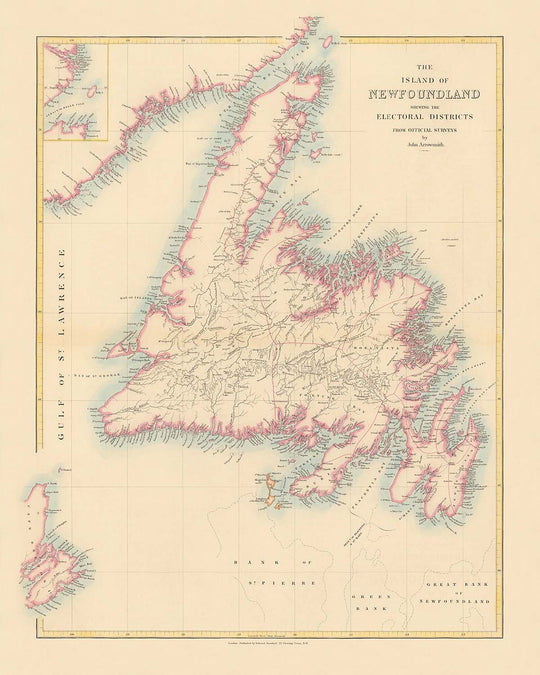 Mappa antica di Terranova di Arrowsmith, 1884: St. John's, Great Bank, Trinity Bay, Fiumi, Distretti Elettorali