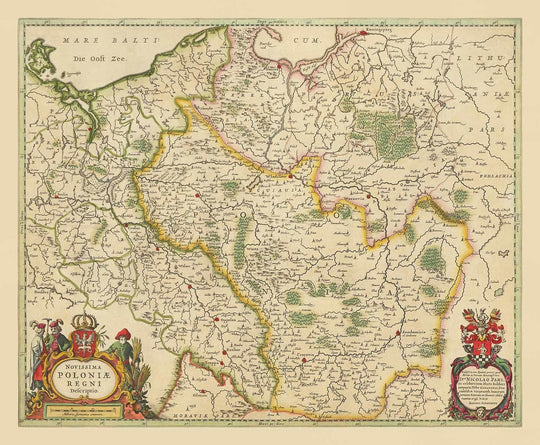 Questa bellissima mappa antica di Jan Jansson mostra la Polonia, la Germania, la Prussia e altre parti degli Stati Baltici nel 1640.