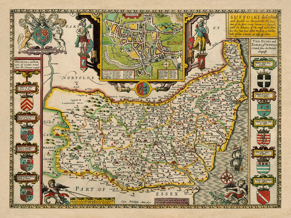 In cima alla mappa c'è un'incisione dettagliata di Ipswich, allora (e ancora) la capitale di questa antica contea. Anche nei 1600, Ipswich era abbastanza sviluppata - potresti persino riconoscere alcune delle strade del centro di Ipswich!