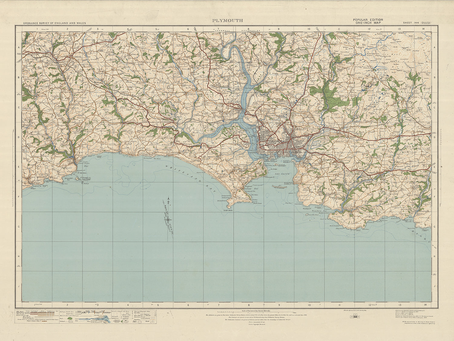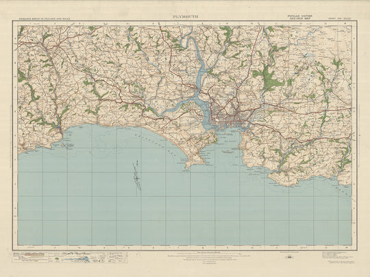Immergiti nella grandezza storica dell'Inghilterra con questa mappa antica dell'Ordnance Survey, intitolata "Foglio 144 - Plymouth," dell'edizione "Popolare" in scala di un pollice prodotta tra il 1919 e il 1926. Questa mappa è una finestra incantevole su un'epoca significativa della storia britannica, coprendo una massa di terra rettangolare che si estende per 18 miglia da nord a sud e 27 miglia da ovest a est, diagonale si estende per un'impressionante 32 miglia. Centrata sul villaggio di Millbrook nel Devon, cattura parti delle contee di Devon e Cornovaglia, entrambe note per le loro coste frastagliate e i pittoreschi paesini.