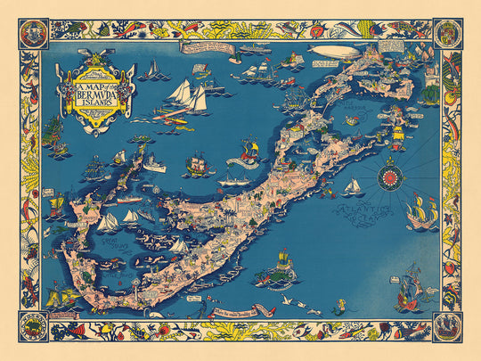 La mappa è adornata con vignette umoristiche e una miriade di illustrazioni, comprese varie tipologie di navi, idrovolanti, dirigibili e persino mostri marini mitologici. Questi elementi non solo aggiungono un tocco giocoso, ma riflettono anche il ricco patrimonio nautico delle Bermuda. Il bordo decorativo, pieno di motivi intricati e illustrazioni, incornicia splendidamente la mappa, rendendola una festa visiva per gli occhi. L'attenzione di Shurtleff ai dettagli e il suo talento artistico sono evidenti in ogni angolo di questa mappa, rendendola un vero capolavoro della cartografia del primo XX secolo.