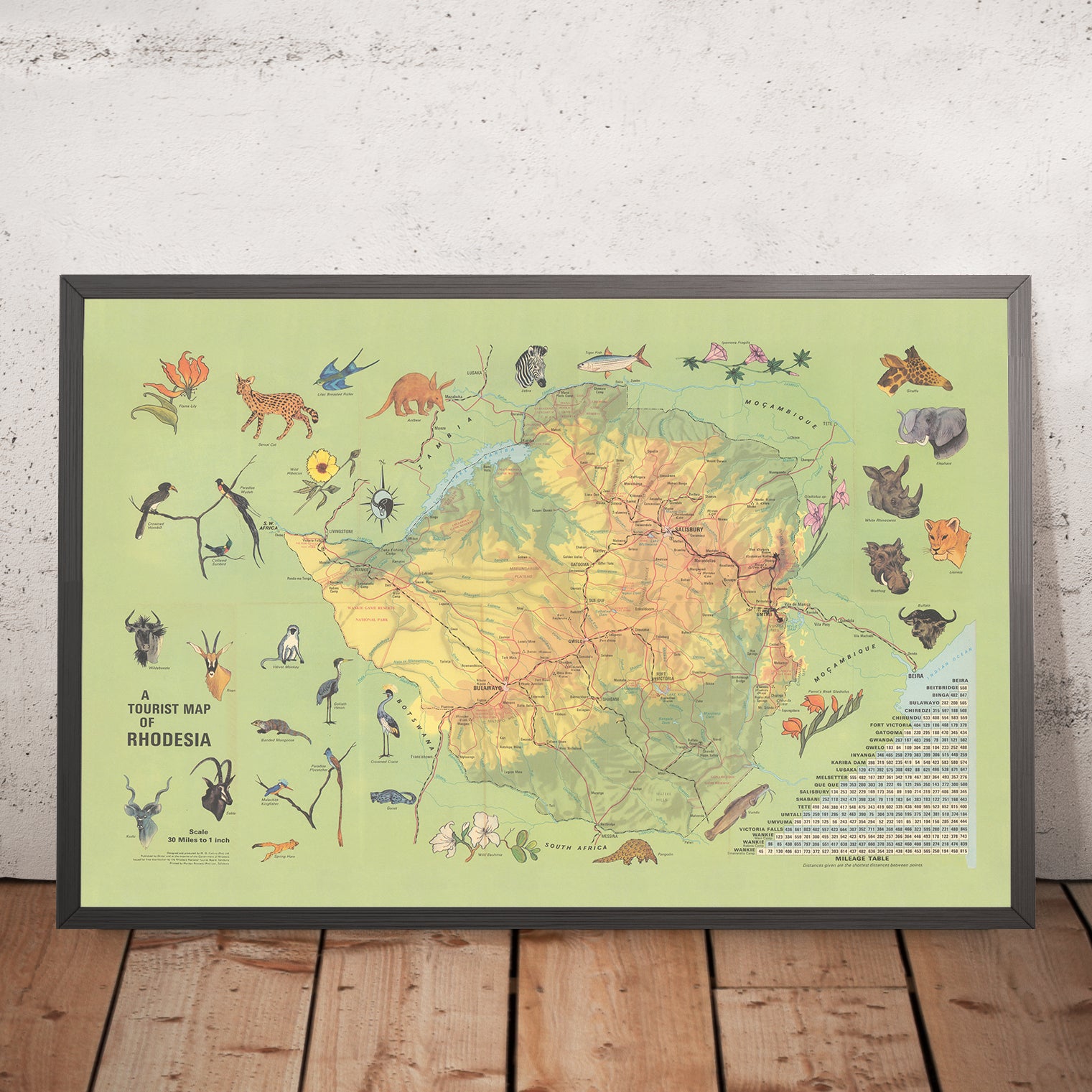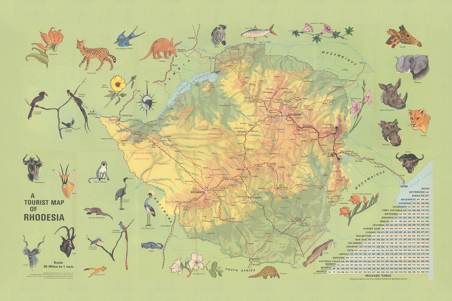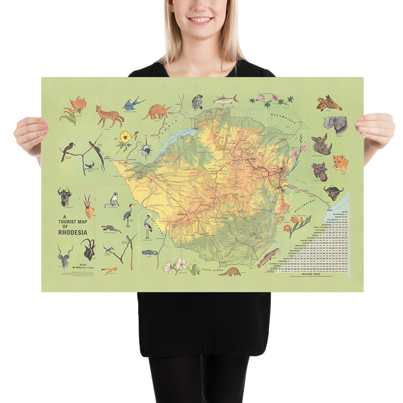 Visual storytelling animates the sheet. Pictorial vignettes place elephant herds along Kariba’s shorelines, lion and sable antelope on the Kalahari fringes, and zebra on the central plateau; fish eagles wheel above blue-toned reservoirs, while baobabs and mopane define the lowveld, and msasa woodlands flame seasonally across the highveld. Decorative borders and cartouches frame these scenes with touristic élan, balancing artistry with orientation. Labels for national parks—Wankie, Matopos—and prominent reserves sit beside emblems of flora such as the flame lily, creating an atlas-page that doubles as a naturalist’s primer. The colorwork is at once instructive and evocative, letting wildlife and topography cue where the roads promise authentic encounters.
