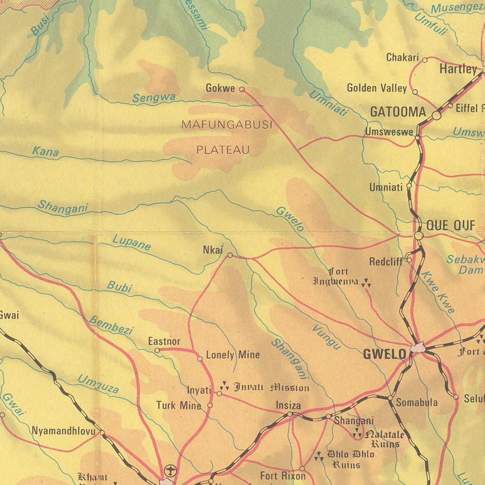 Urban cartography and travel planning are treated with equal care. Salisbury appears as the radiating hub, dispatching travelers along tarred arterial roads and rail spurs to Bulawayo, to Umtali and the port of Beira, and across the border toward the South African Rand. Mileage tables—neatly arrayed—translate the dream of distance into practical stages, turning the traverse from Fort Victoria to Great Zimbabwe’s stone acropolis or from Bulawayo to Wankie (Hwange) into a weekend certainty. Rail corridors parallel key highways, a reminder of the era’s blended modalities: overnight sleepers to frontier towns, day drives to game parks, and scenic detours plotted with almost editorial clarity.