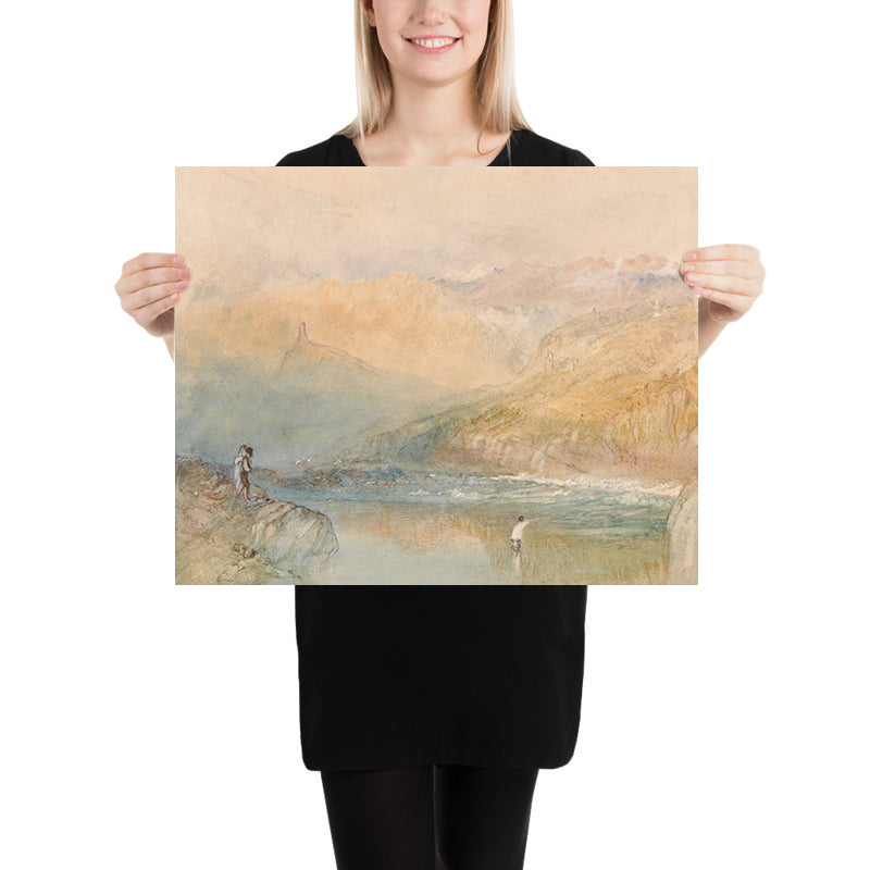 On the Mosel, Near Traben-Trarbach (1841) by Turner captures the Romantic spirit at its zenith: a tranquil river bend bathed in honeyed light, distant hills softening into mist, and small human presences that lend scale to nature’s immensity. Painted late in his career, Turner’s mastery of atmosphere and emotion is on full display here, inviting viewers to linger in a moment where sky, water, and land dissolve into luminous haze. Rooted in the European travel that shaped so much of his output, this scene from Germany’s Mosel valley distills the era’s fascination with solitude, reverie, and the sublime.