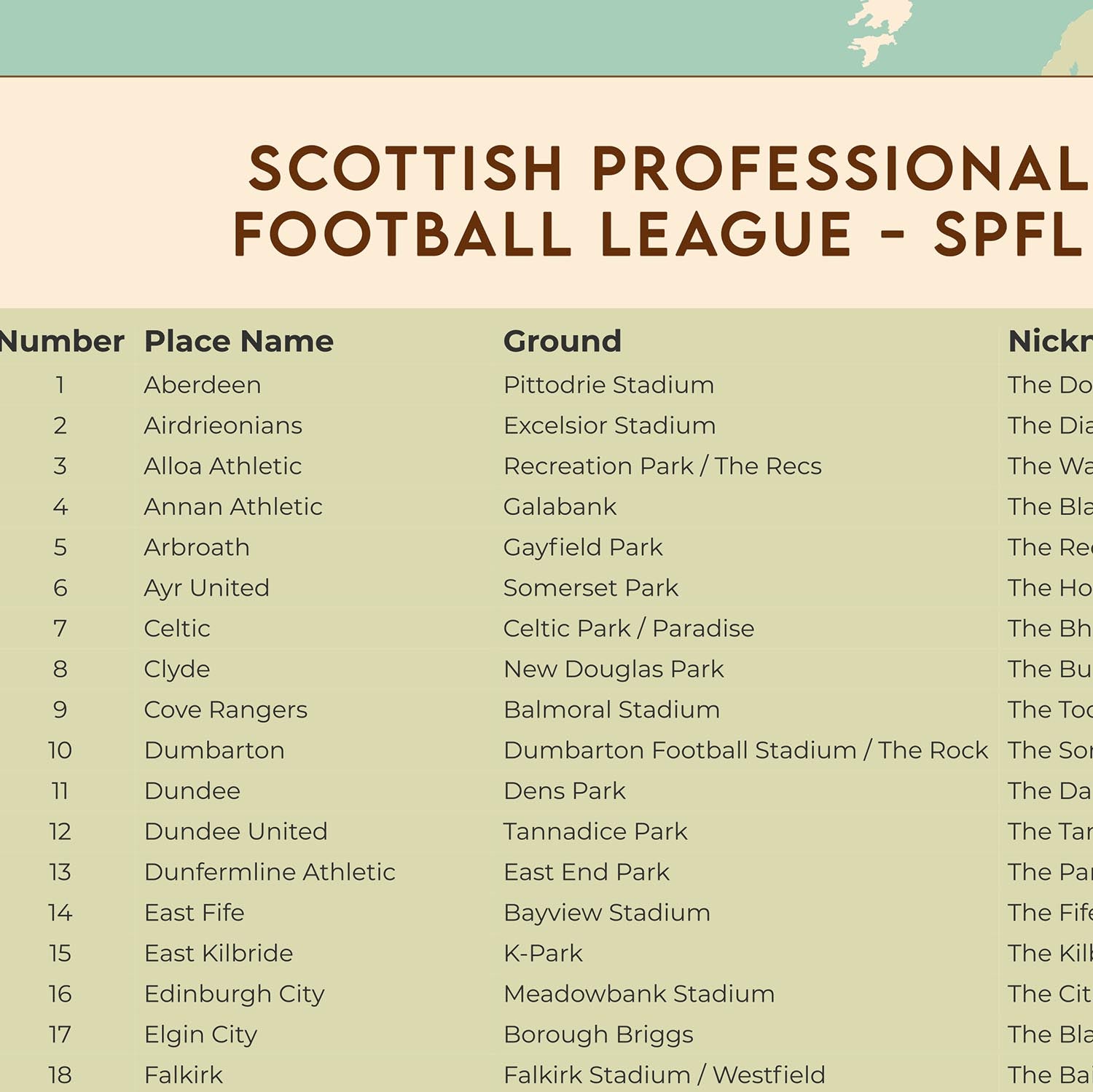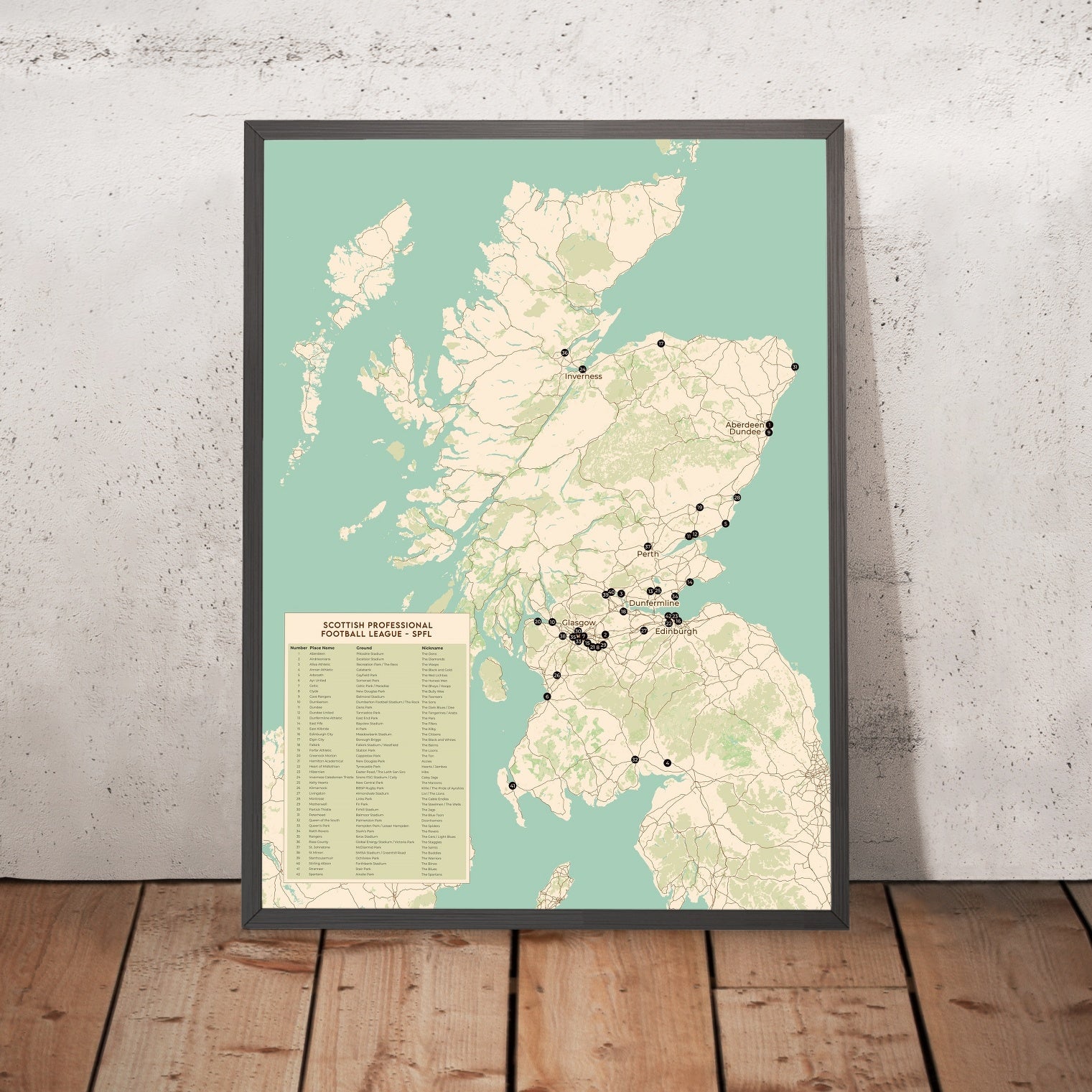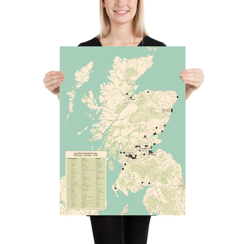 Questa moderna mappa della Scozia di The Unique Maps Co. mostra tutti i 42 club della Scottish Professional Football League (SPFL) in un design pulito, degno di essere appeso — una perfetta istantanea della vera geografia del calcio scozzese, dalla fitta rete di rivalità del Central Belt ai lunghi viaggi verso le Highlands e lungo le coste.