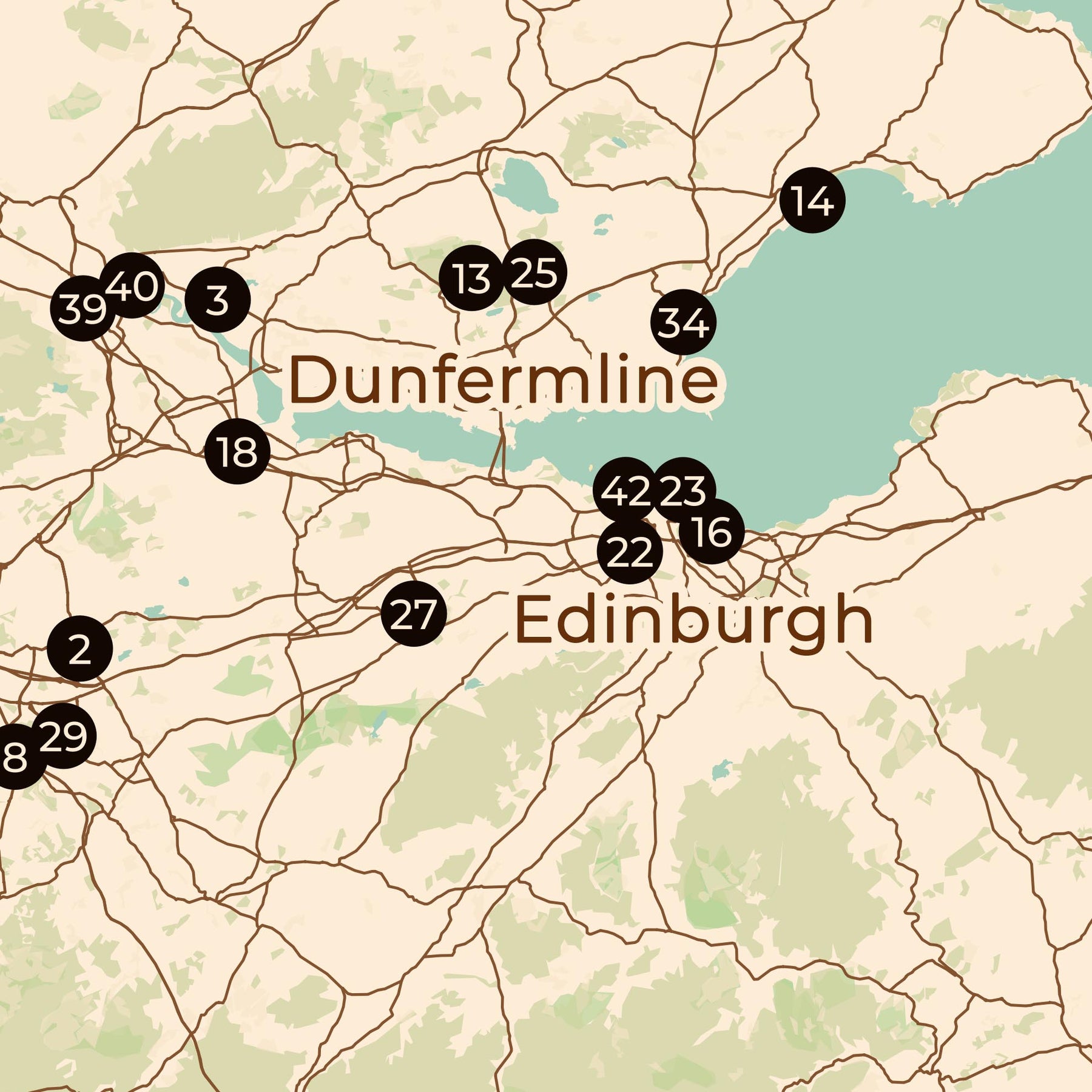 Su uno sfondo con una mappa contemporanea della Scozia, la posizione di ogni club è segnata da un punto numerato, rendendola immediatamente piacevole da esplorare. Si vede la forma delle trasferte, la logica dei derby locali e il modo in cui le comunità calcistiche si concentrano attorno a paesi, città e corridoi di trasporto — tutto in un solo sguardo.