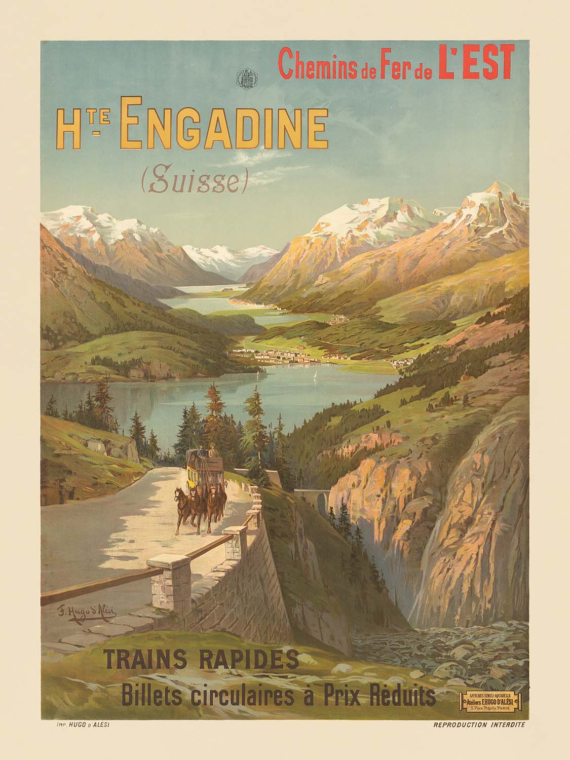 Upper Engadine Travel Poster: Hte. Engadine – Trains rapides by F. Hugo d’Alesi