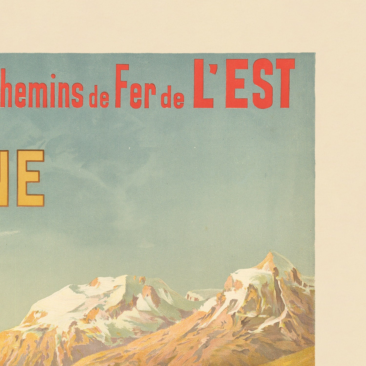The subject here is the Upper Engadine, the high valley that includes resorts such as St. Moritz and a chain of lakes that gleam like linked mirrors. In the age of “trains rapides,” the French Eastern Railway promoted swift connections from Paris to this Swiss paradise, enticing travelers with circular tickets at reduced prices—exactly as the poster proclaims: TRAINS RAPIDES and Billets circulaires à Prix Réduits. The image distills the promise of Alpine leisure at a time when adventurous holidays and restorative mountain air were becoming hallmarks of European travel.