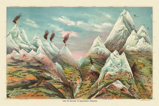 Vista della natura nelle regioni ascendenti di Levi Walter Yaggy è un'illustrazione esemplare del 1893 che cattura la grandiosità del mondo naturale attraverso una vibrante cromolitografia. Yaggy, rinomato per i suoi grandi grafici educativi, ha creato alcuni dei più visivamente impressionanti materiali didattici del XIX secolo. Quest'opera in particolare è una brillante rappresentazione della sua abilità nell'usare colore e contrasto per dare vita a scene geografiche e naturali in contesti educativi.
