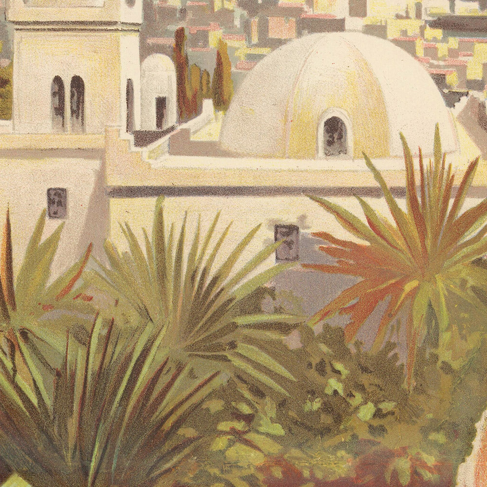 This Alger poster stands at the crossroads of history and modernity. In 1898, the P.L.M. railway connected inland Europe to Mediterranean ports, while the Compagnie Générale Transatlantique extended the journey across the sea—turning Algiers into a gateway city for leisure and commerce. The work celebrates that seamless journey: rails to the coast, ship to the Maghreb, and the cultural encounter that awaited travelers in North Africa during a time when international tourism was opening to a broader middle class.