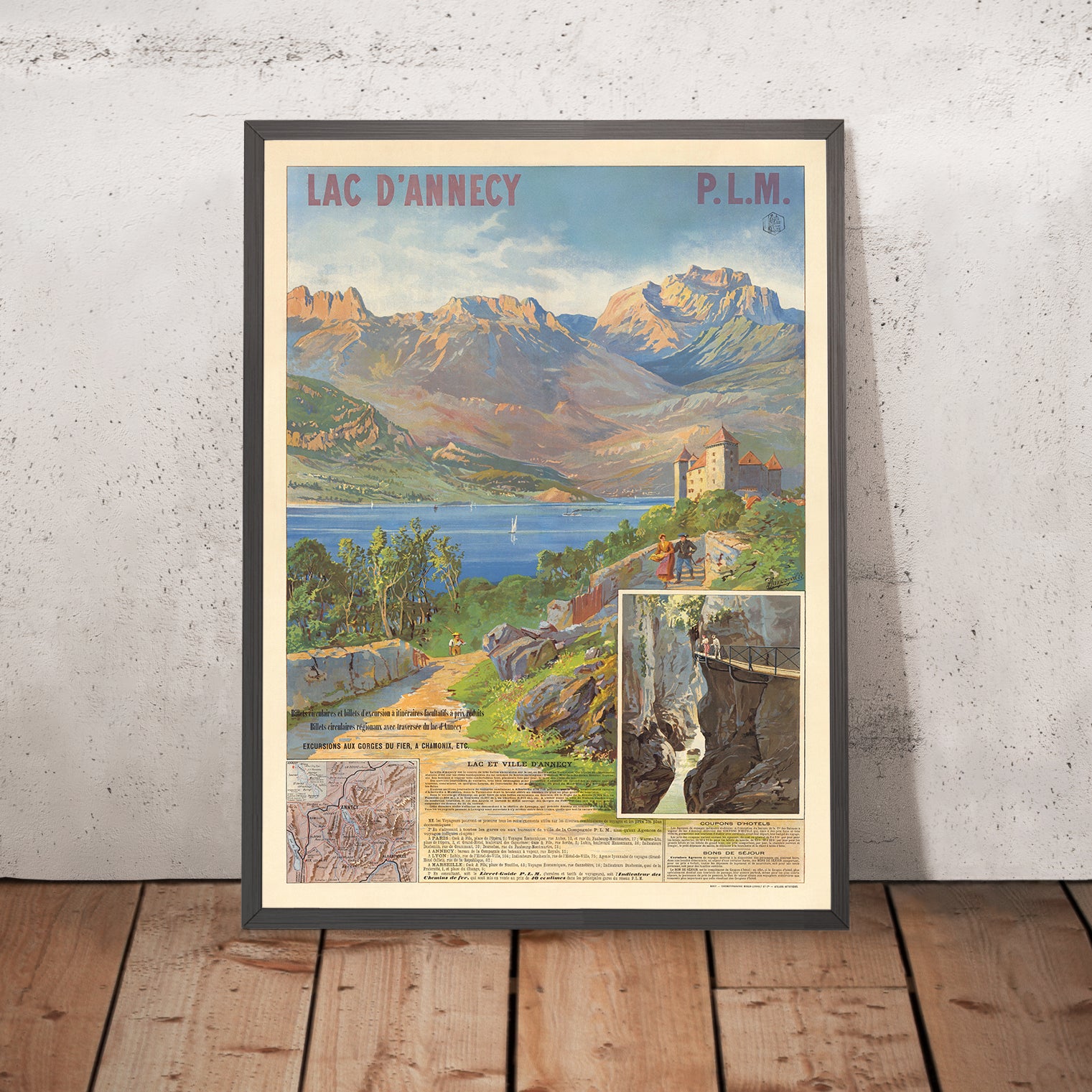 The subject here—Lac d’Annecy and its historic lakeside town—was a dream destination promoted by the Paris–Lyon–Méditerranée (P.L.M.) railway, whose network opened the Alps to leisure travel in the late 19th century. This poster places viewers at a vantage where culture and nature meet: the medieval castle and tidy roofs of Annecy stand as guardians of the shoreline, while figures stroll, boat, and gaze across the expanse, emblematic of a new era of recreation and alpine air cures. The scene conveys not only a promise of arrival but the soothing rhythm of waterside life.