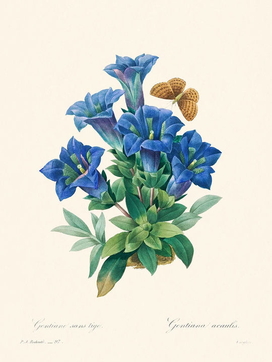 Gentiana Acaulis, crafted by the eminent botanical artist Pierre-Joseph Redouté, stands as a brilliant testament to the art of botanical illustration from the early 19th century. Published in 1802, this piece captures the delicate beauty of the Gentiana acaulis, a species renowned for its vivid blue blooms, and is now available as a fine art print.