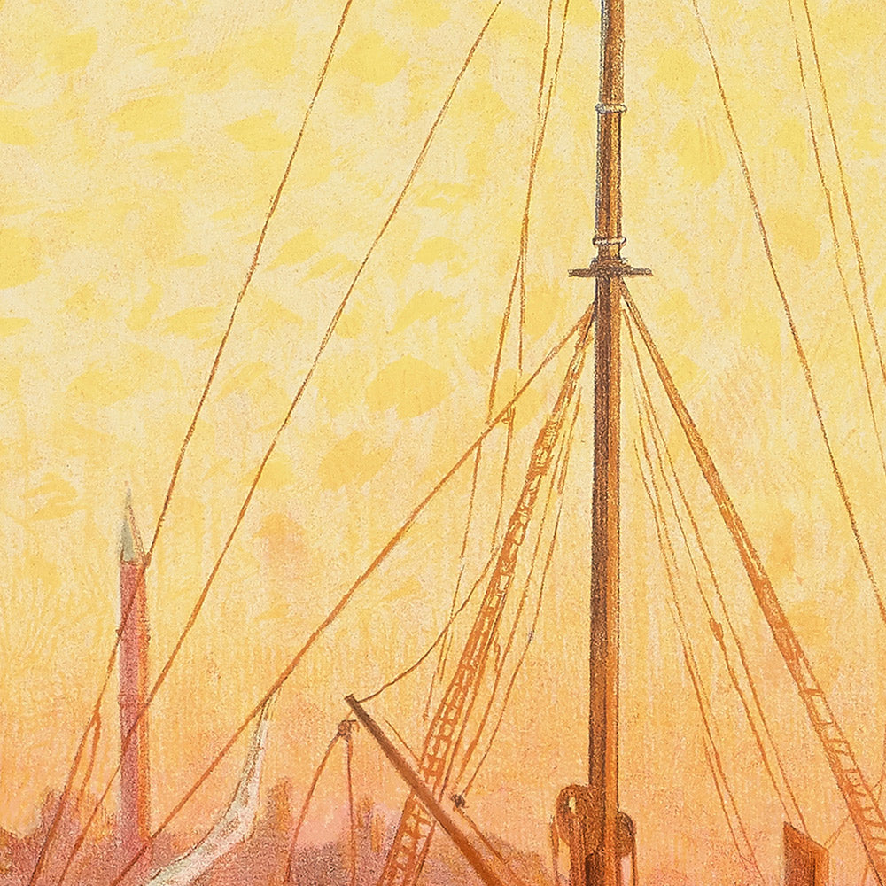 D’Argence’s palette is masterfully pitched. Dominant reds and golden yellows bathe the harbor in a late-afternoon glow, while cooler blues of the water provide a poised counterpoint. The stippled sky reads like a soft veil of light; the ship’s clean hull lines and funnel smoke add momentum; and the sans-serif masthead at the top is bold enough to command attention without overwhelming the scene. The result is both decorative and dynamic—a timeless blend of ornament and motion that suits contemporary interiors as well as classic or eclectic rooms.