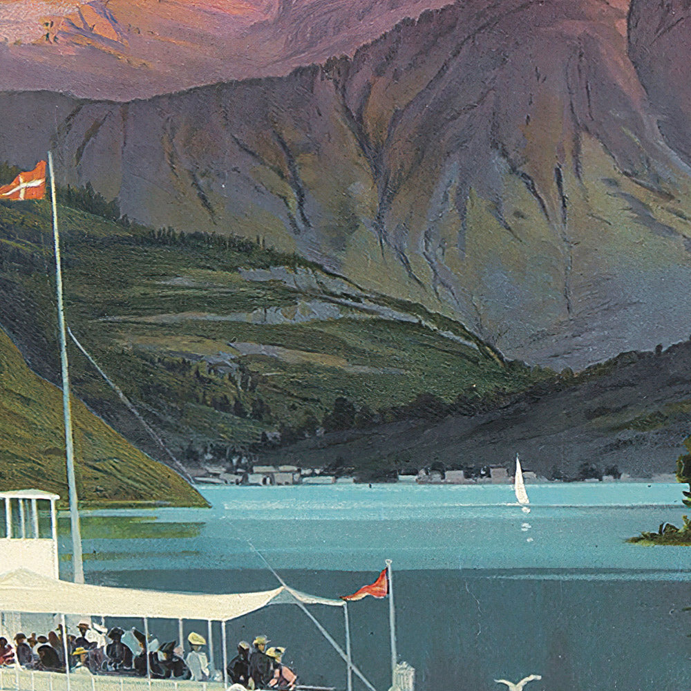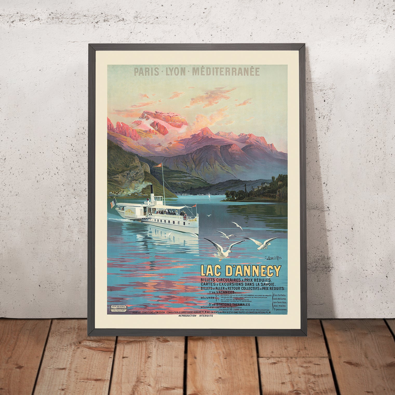 Le Lac d’Annecy, Paris-Lyon-Méditerranée by Frédéric Hugo d’Alesi (1900) captures the dreamlike beauty of the French Alps at the moment rail travel made such vistas newly accessible. Designed in the Art Nouveau spirit of unifying art and everyday life, this antique travel poster invites the viewer to the shores of Lake Annecy—Haute-Savoie’s luminous alpine jewel—where rose-tinged peaks descend to bands of blue-green water and gulls sweep across a mirror-still surface. Created for the PLM railway at the height of Europe’s Belle Époque tourism boom, it distills the promise of effortless escape: a serene lake ringed by undulating mountains, a poised boat suggesting arrival, and elegant lettering that turns destination into desire.