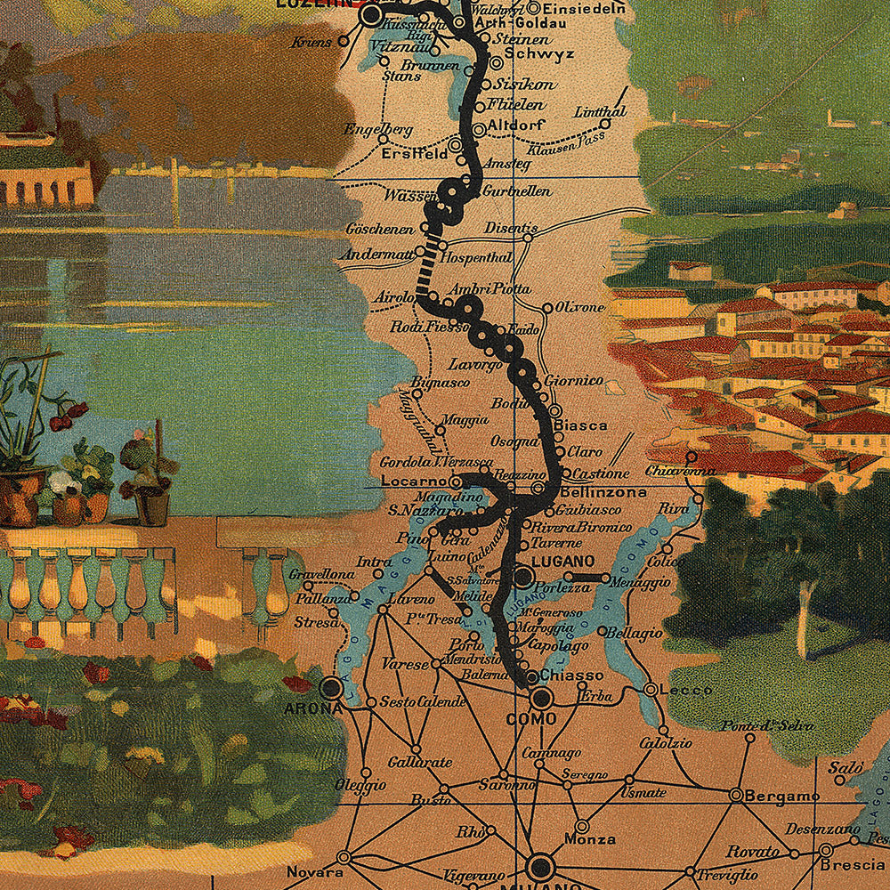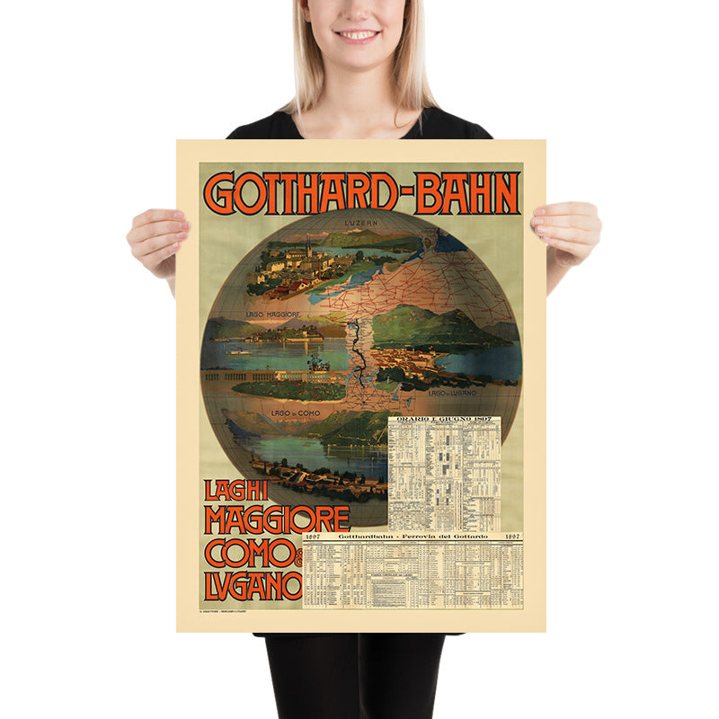 Historically, the poster marks a pivotal moment in Alpine travel. The Gotthard line, one of Europe’s great engineering achievements of the late nineteenth century, linked northern Europe with the sunny lakes of the south. By 1897, rail and steamer networks knit together waterfront towns on Maggiore, Como, and Lugano, ushering in a new era of cosmopolitan leisure. This design captures that promise: modern transport delivering the romance of grand tours, lake breezes, and mountain vistas.