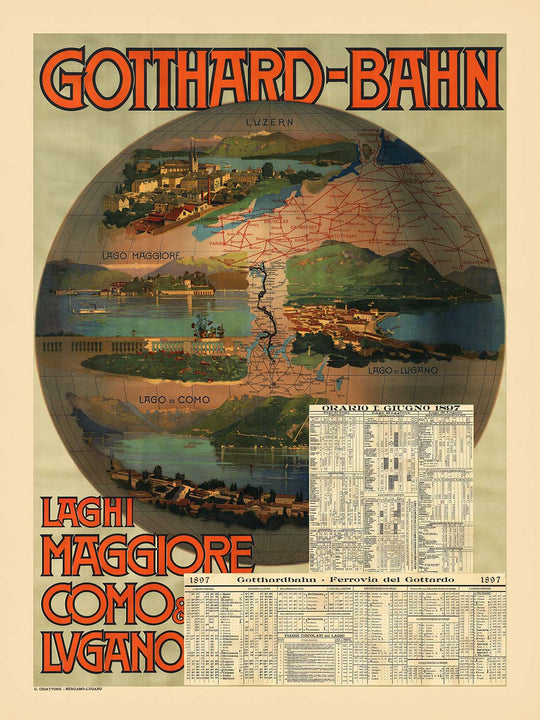Lake Como, Lake Maggiore & Lake Lugano Travel Poster: Gotthard-Bahn by Gabriele Chiattone, 1892