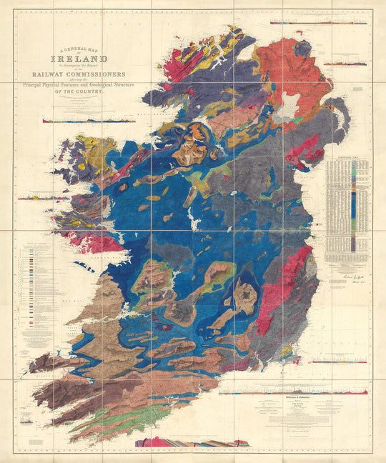 This is one of the finest old, colour maps of Ireland. Originally titled A General Map of Ireland, created for the Railway Commissioners in 1837 by RJ Griffith, this is a wonderfully detailed map of the entire island with the geological (rock) and palaeontological (fossils) features hand coloured.