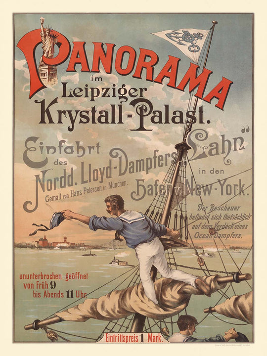 Panorama in Leipziger. Krystall-Palast (1890) is a striking late-19th-century travel poster by an anonymous lithographer working in Leipzig, Germany. Created to promote a panoramic spectacle at the city’s famed Krystall-Palast entertainment complex, the design captures the excitement of the age: transatlantic steamship travel, grand urban skylines, and the promise of modernity. With the Statue of Liberty rising in the distance, the poster deftly links Leipzig’s cosmopolitan stage culture to the magnetic pull of New York, embodying the era’s Art Nouveau-inflected elegance and its fascination with industry, leisure, and global horizons.