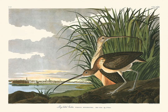 This particular curlew illustration highlights Audubon’s fascination with the bird's distinctive elongated bill, an adaptation for probing deep into the sand for food. The rich hues and dynamic posture of the curlew reflect Audubon’s unrivaled skill in capturing both the essence and the anatomical precision of his subjects, making this print a timeless investment for nature aficionados and art enthusiasts alike.