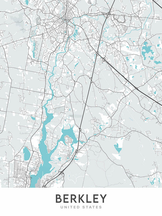 This map of Berkley, Massachusetts is a modern cartographic representation of the city and its surroundings. The map focuses on the intricate details of the city's street layout, providing a visually captivating piece of art that is both informative and aesthetically pleasing. The map covers a significant portion of the city, including the city center, as well as several surrounding neighborhoods and towns. It also encompasses a number of major roads, routes, and highways, making it an ideal tool for navigation and exploration.