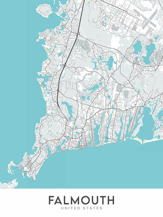 This map of Falmouth, Massachusetts, is a modern, detailed street map without labels. It focuses on the city center and the surrounding areas, providing an accurate and visually appealing representation of this charming coastal town. The map covers an area of approximately 9 miles from west to east and 11 miles north to south, offering a comprehensive view of Falmouth's diverse neighborhoods, landmarks, and natural features.