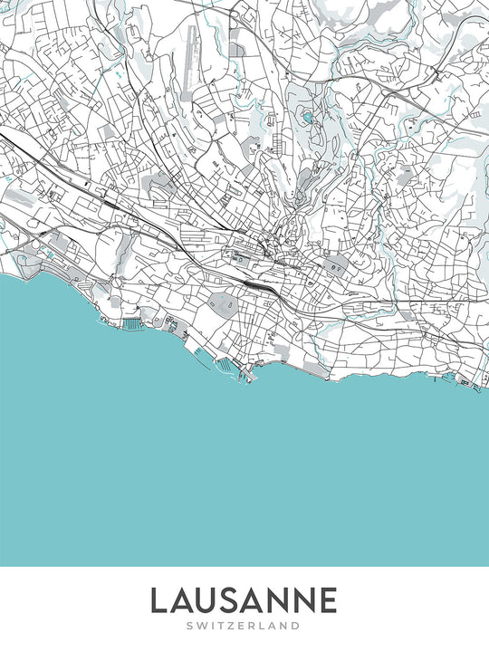 Modern City Map of Lausanne: Lake Geneva, Palais de Rumine, Cathedrale, Chateau St-Maire, Parc de Mon-Repos