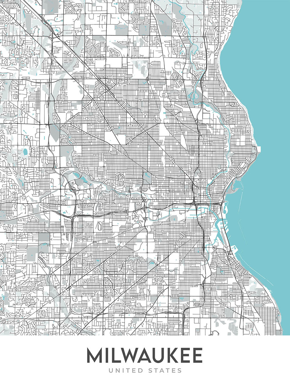 This map of Milwaukee, Wisconsin, is a modern and detailed cartographic artwork that focuses on the city's street layout without the distraction of labels. The map covers a rectangular area that stretches from the Bay View neighborhood in the south to the Milwaukee County Zoo in the west, and from the Menomonee Valley in the east to the Mitchell International Airport in the south. The city's downtown area, including the Historic Third Ward, Westown, and East Town neighborhoods, is prominently featured in the center of the map.