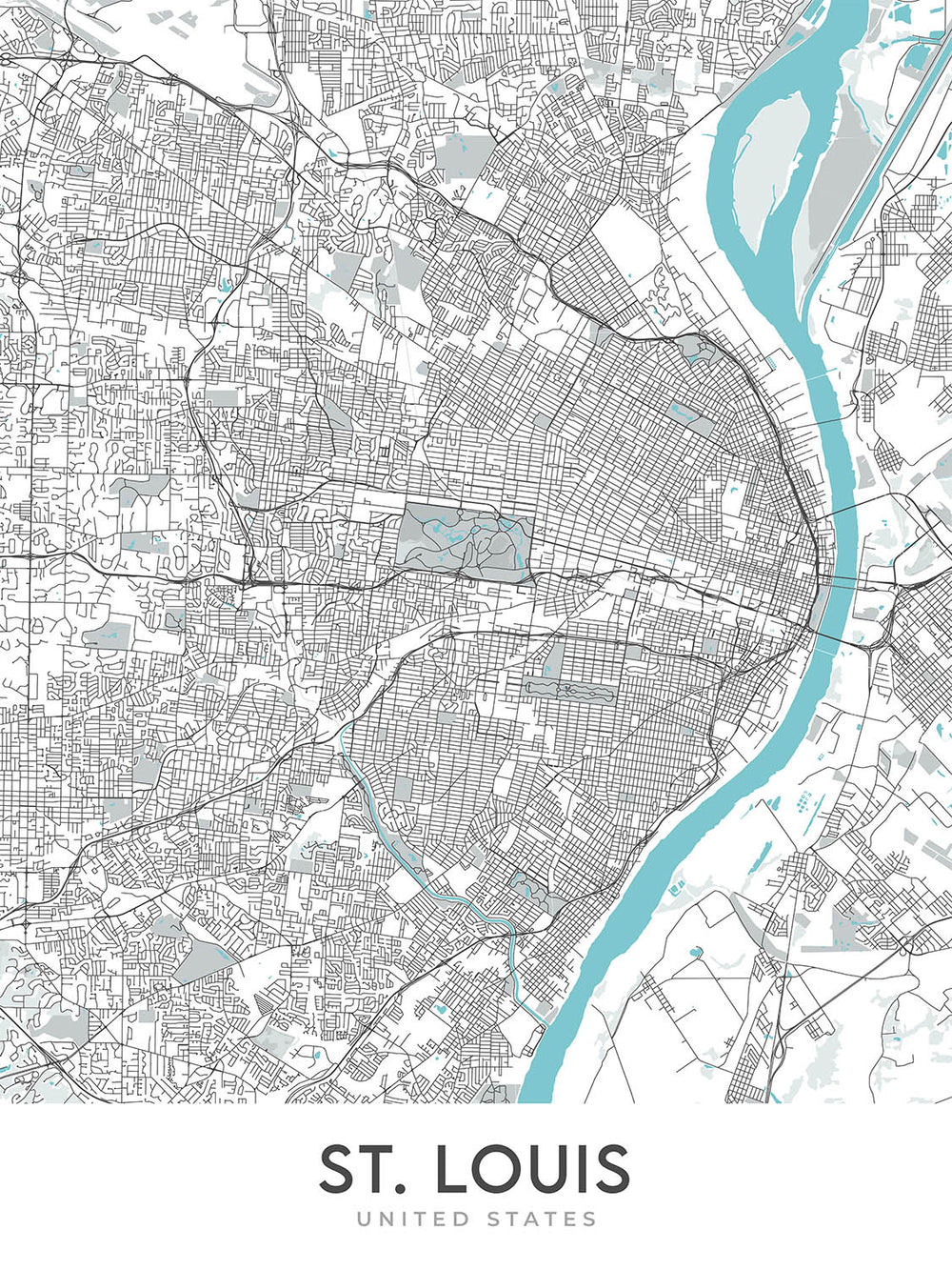 Modern City Map of St. Louis, MO: Gateway Arch, Busch Stadium, Forest Park, Soulard, Central West End