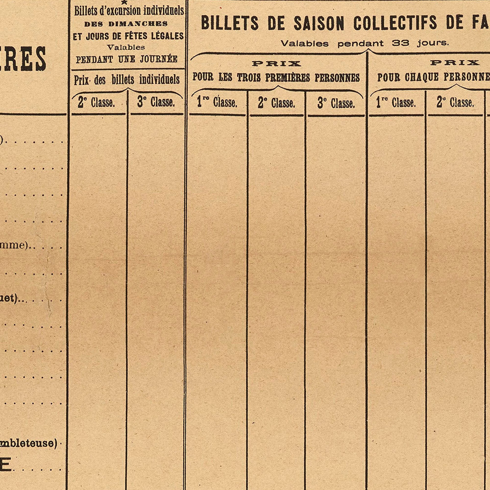 Chemin de fer du Nord. Excursions à la mer. Saison d’été by Gustave Fraipont (1890) captures the Belle Époque romance of seaside travel on France’s northern coast. Created for the Compagnie des Chemins de fer du Nord, this antique travel poster promotes summer journeys “à la mer” with Fraipont’s refined blend of illustration and typography. A celebrated painter, illustrator, and poster artist born in Belgium and later naturalized in France, Fraipont distilled the new leisure culture of rail travel into scenes and lettering that feel both elegant and inviting. Here, a sun‑washed palette and period type evoke the soft warmth of a day trip to the coast; the composition is rendered almost entirely in sepia-browns, beiges, and honeyed yellows, giving the seaside scene a nostalgic, sun‑bleached glow.