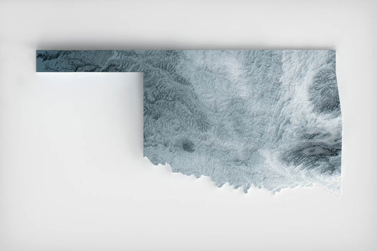 Experience Oklahoma, United States of America—a land shaped by the meeting of prairies, rolling hills, and ancient mountains. This captivating map brings Oklahoma’s diverse terrain to life, using light and shadow to accentuate its dramatic landscapes, from the highest ridges to the broad river valleys.