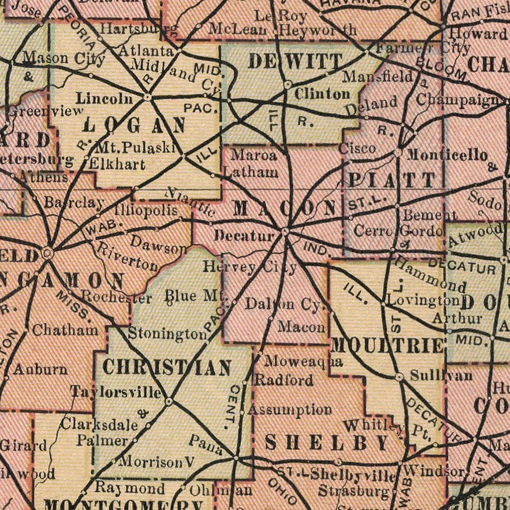 - Focuses on the state of Illinois, highlighting its counties, depicted in detailed segments reflecting historical boundaries.