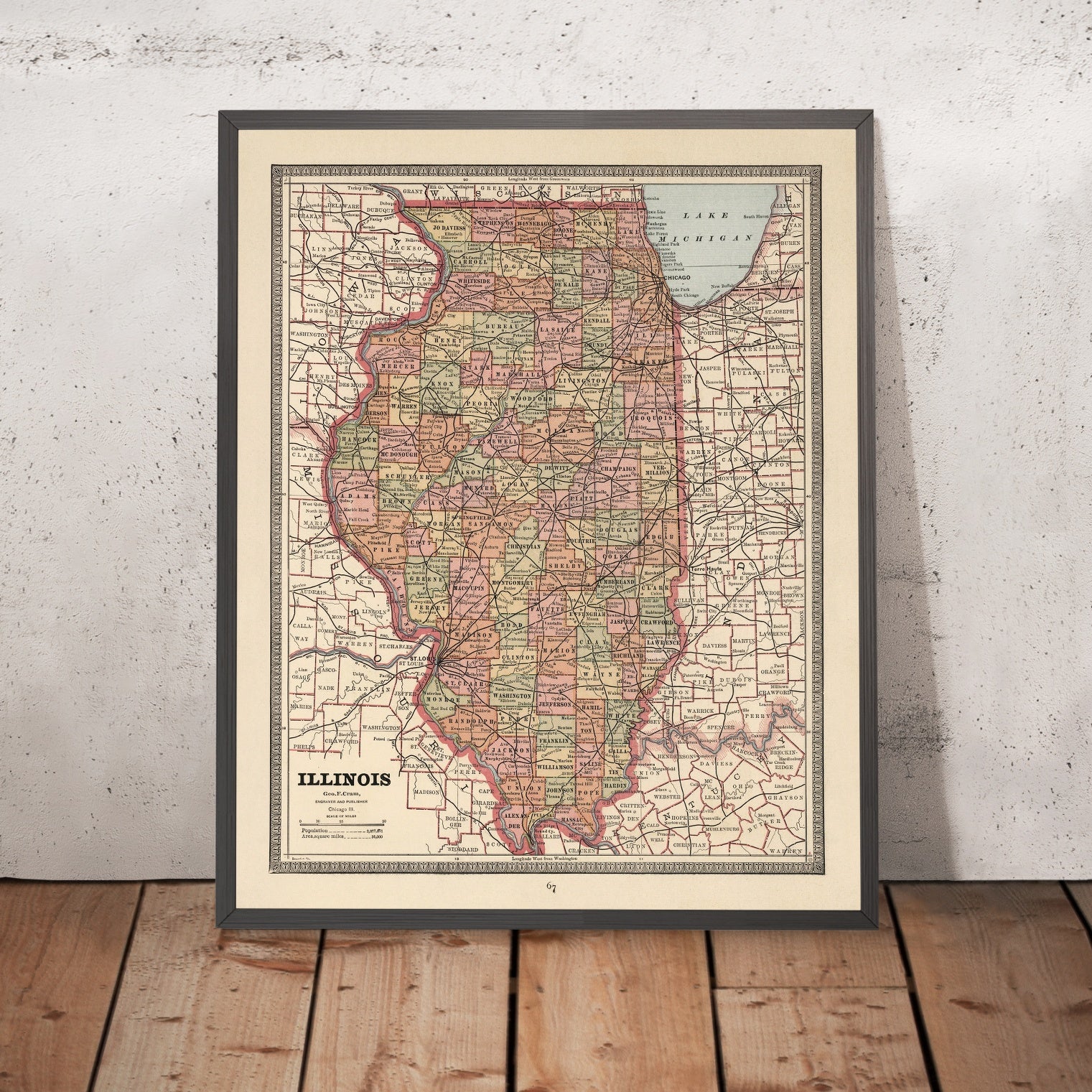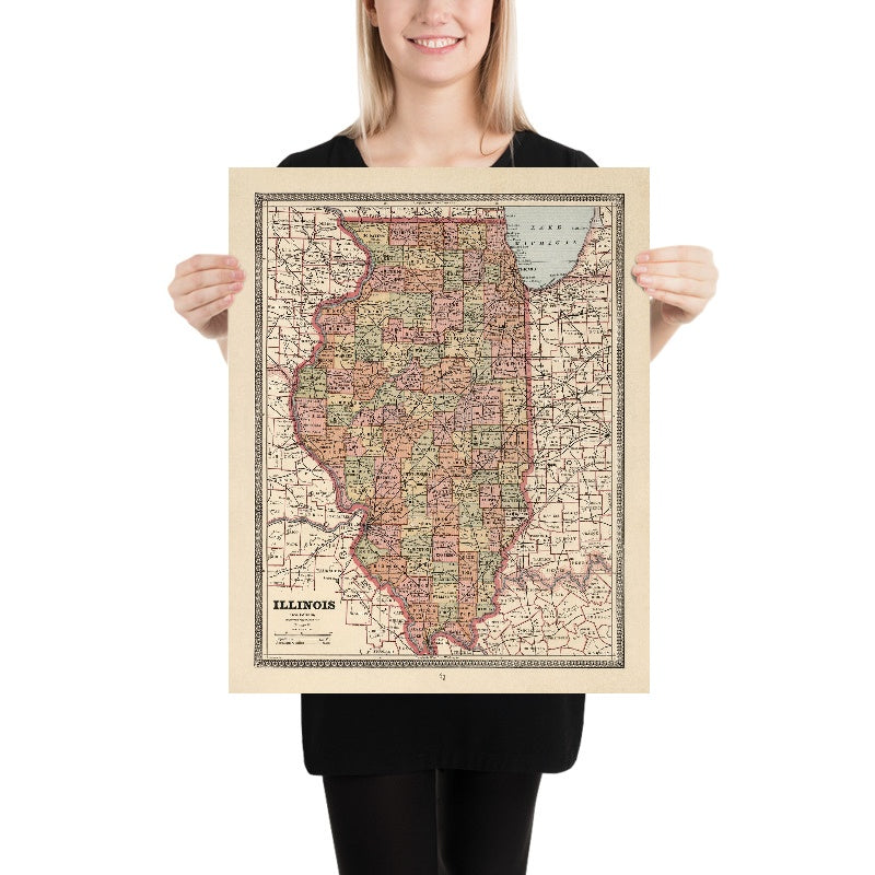 Rare Old County Map of Illinois by Cram, 1883: Chicago, Springfield, Lake Michigan, Mississippi R., Illinois River
