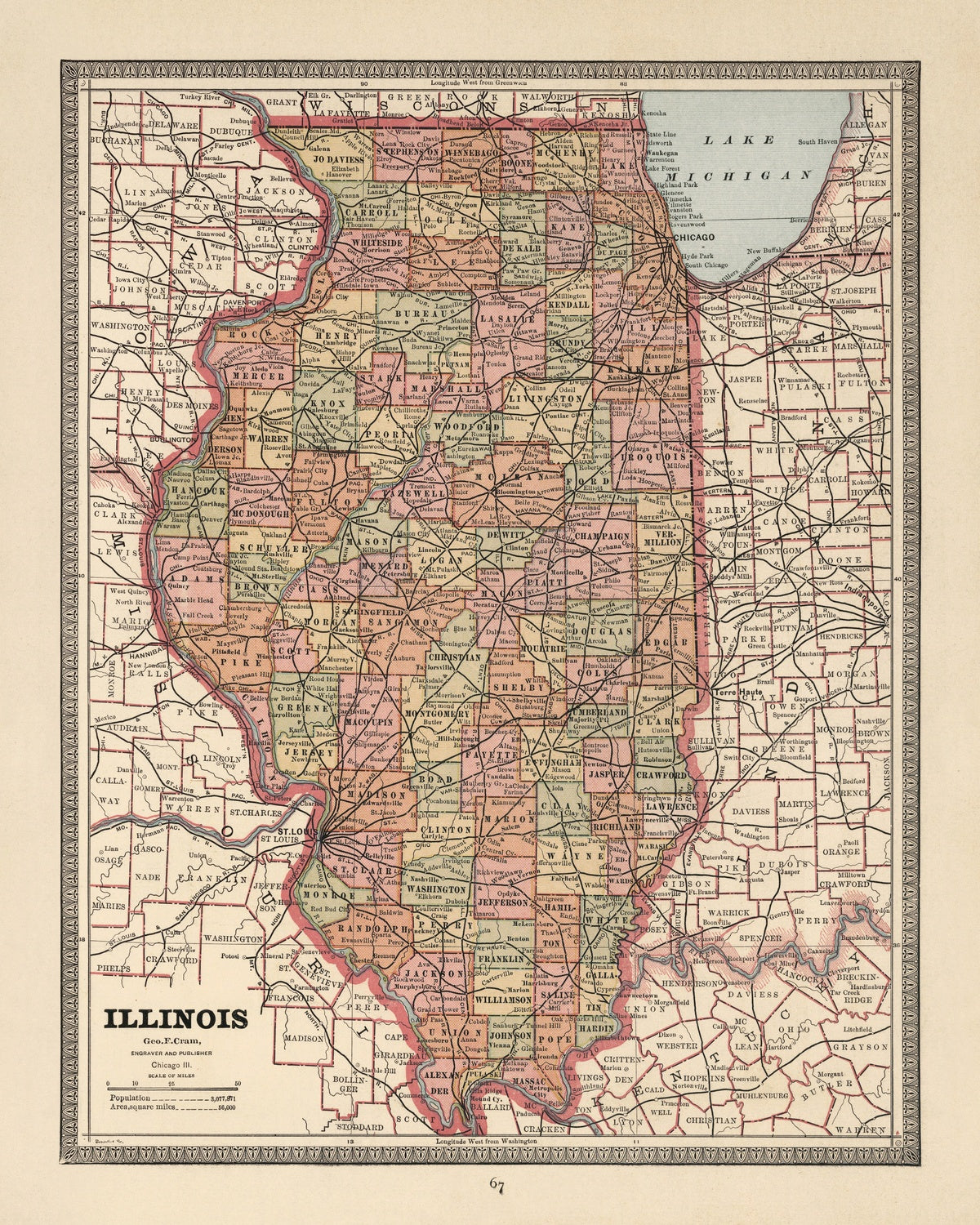 Illinois, published in 1883, captures the Prairie State at a formative moment, poised between frontier memory and industrial might. Issued in the first edition of George Franklin Cram’s ambitious world atlas, it marries precision with accessibility and records the era’s evolving geographic standards by plotting prime meridians from both Greenwich and Washington. The composition balances confident color with instructive detail: each county washed in its own tone and crisply contained by red borders, major towns and routes keyed for immediate orientation. It is a map made to be read and used—by merchants tallying shipments, travelers choosing routes, and citizens taking stock of a rapidly changing landscape—yet it retains an unmistakable elegance. Topography appears as fine hachures, lending dimensionality to a state famed for its level horizons.