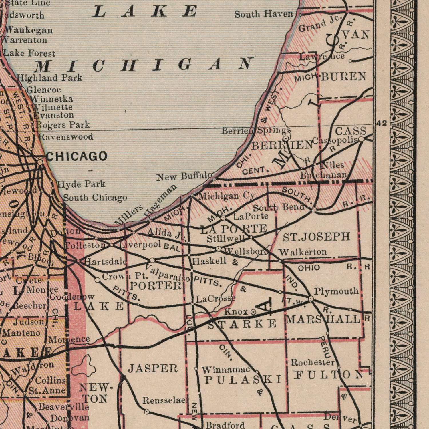 Transportation networks animate the plate, revealing the state’s modern pulse. Railroads radiate from Chicago like spokes, binding Aurora, Joliet, Elgin, and Waukegan to the metropolis and carrying lines west toward Rockford and the Mississippi, south through Peoria and Springfield, east through Champaign and beyond. Trunk routes reach down the long axis of the state toward Cairo, while roads lace county seats to market towns. The historic Illinois & Michigan Canal still registers as a crucial hinge between the Great Lakes and the Mississippi basin. Urban centers are distinctly keyed—Chicago emphatically so—while Springfield, Peoria, Rockford, and emergent nodes like Naperville and Aurora punctuate the grid. Seen together, the counties, rails, and rivers compose a kinetic portrait of Illinois on the cusp of modern America.