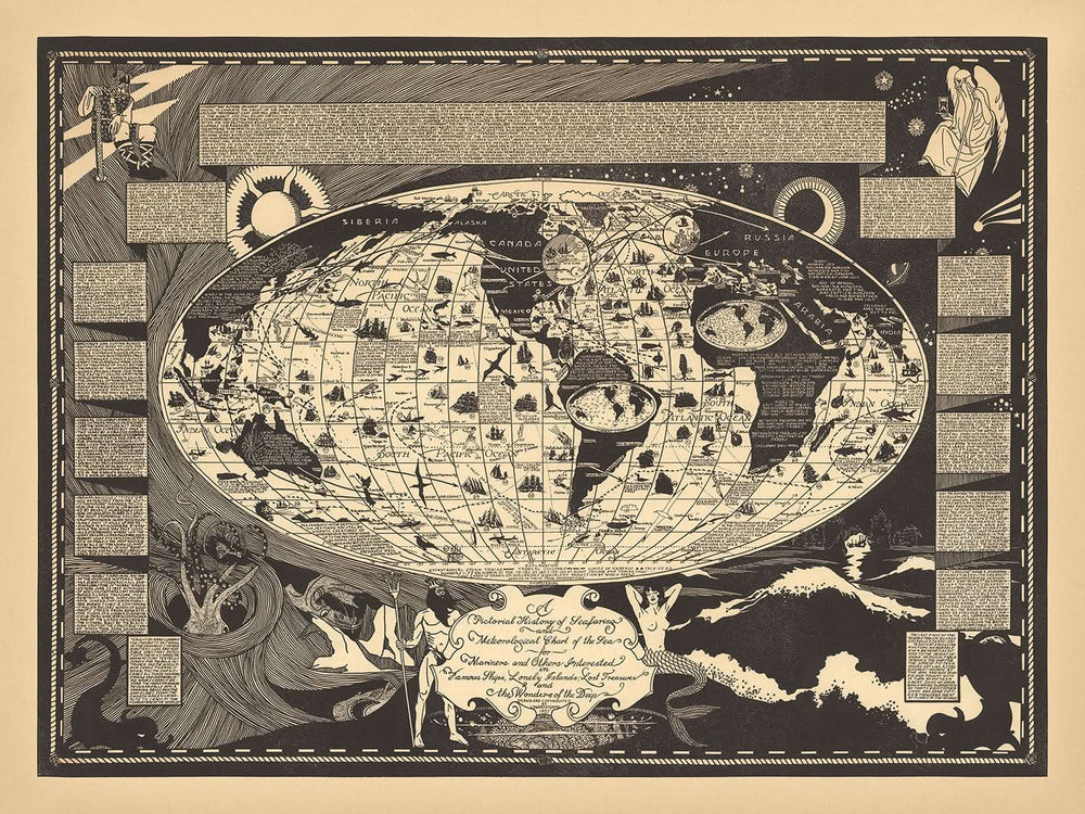 Edward A. Turpin, renowned for his thematic and pictorial maps, masterfully combines art and cartography in this piece. His work not only charts the physical world but also the intangible stories of human endeavor and discovery. The map is adorned with a decorative title cartouche, featuring mermaids and mythical sea creatures, inviting viewers to delve into the mysteries of the deep. Each illustration and annotation tells a story, capturing the imagination and transporting you to an era of adventure and exploration.