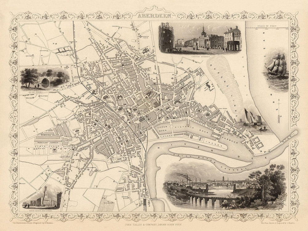 Engraved by John Rapkin and published by J. Tallis & Co in 1851, this is one of the finest and most detailed historic maps of Aberdeen that you can find from the peak of industrialised Victorian Britain.