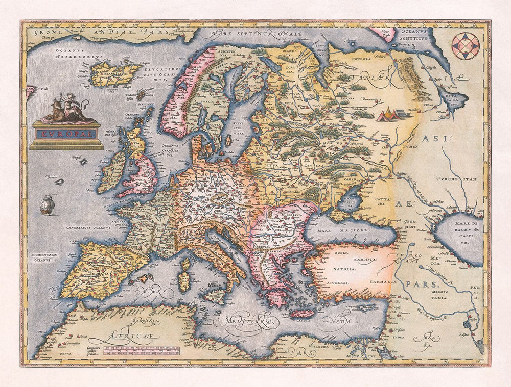This is a very fine example of the very first atlas map of Europe, first published by Dutch cartographer Abraham Ortelius in 1570. This map was originally handcoloured almost exactly 450 years ago and has been lovingly restored by The Unique Maps Co.