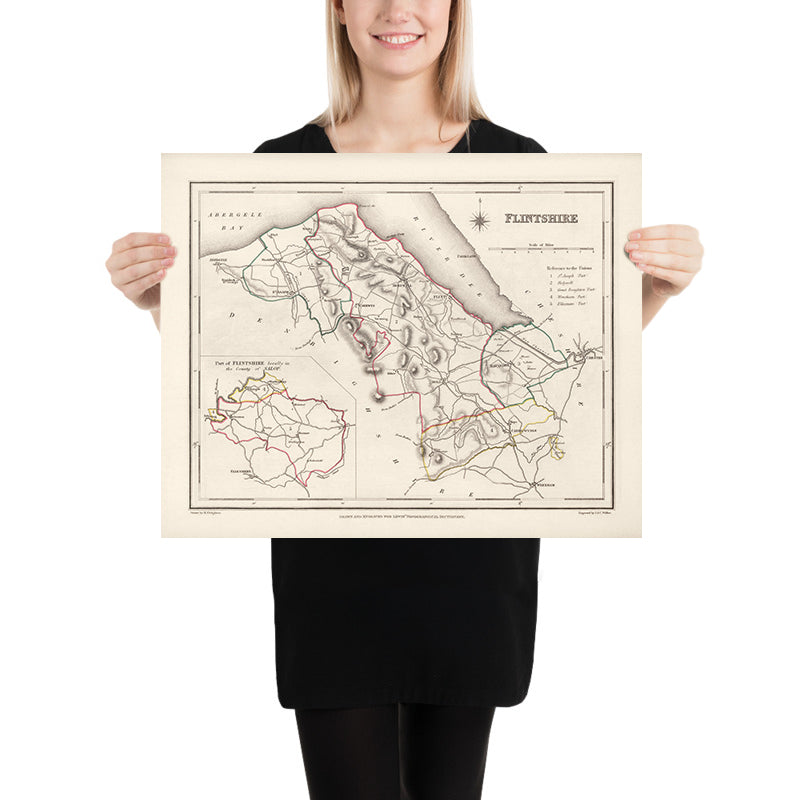 Relief is rendered with disciplined hachures, drawing the eye along the spine of upland ridges that descend toward the Dee estuary. The Clwydian heights around Mold and the broken ground toward Halkyn Mountain emerge in restrained chiaroscuro, while river courses and canals thread through valleys to the coast. The cartographer traces the sinuous Dee as it widens into tidal flats and ports, a maritime threshold that shaped Flintshire’s economy. An inset isolates a detached portion of the county within the County of Salop, clarifying the peculiar geography of the Maelor and other enclaves that confounded administrators and travelers alike. Symbols for bridges, ferries, and crossroads punctuate the network, and the graduated depiction of roads and railways shows how overland movement concentrated along corridors that respect both gradient and historical habit.
