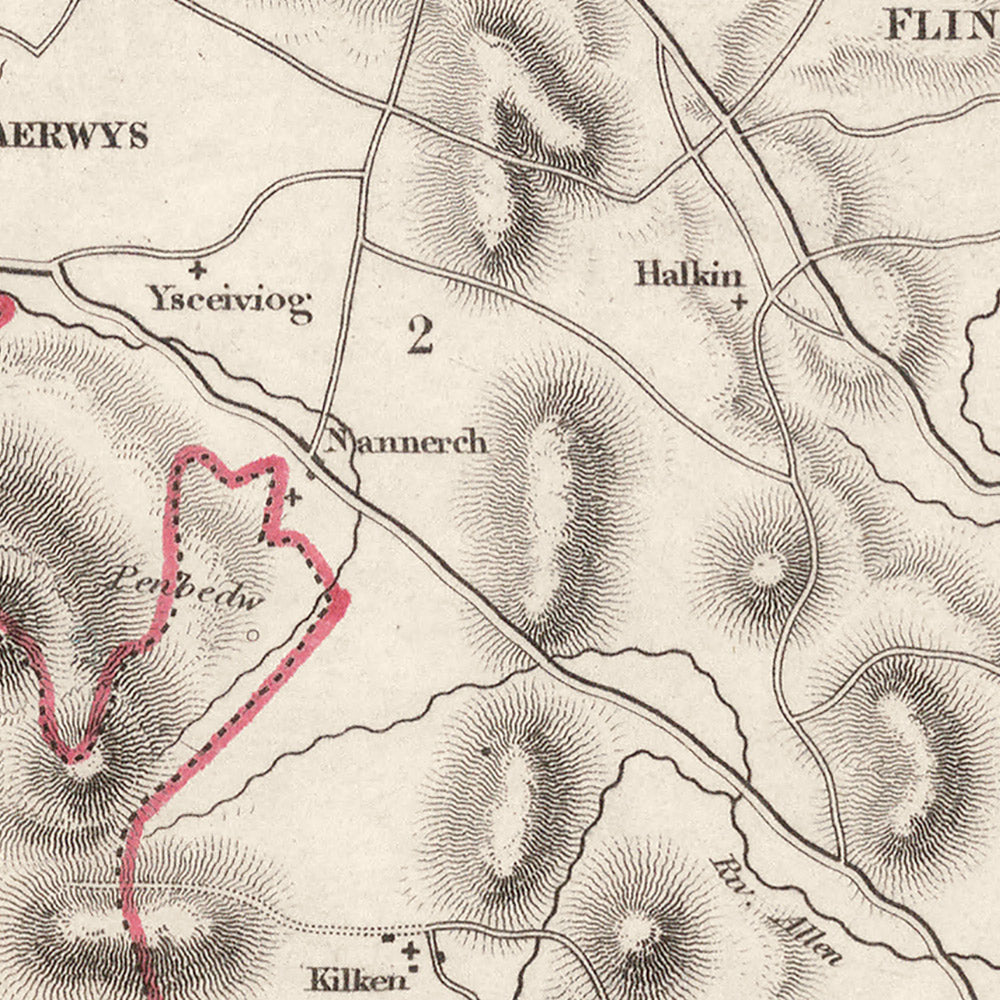 Settlement names anchor the narrative of the county. Flint, with its castle and riverfront, sits opposite the English shore, a sentinel over the Dee. Mold, historically the county town, gathers roads from the hills and is ringed by villages whose fortunes rose with quarrying and lead. Holywell, famed for St Winefride’s Well, appears as a devotional and commercial magnet, while Connah’s Quay signals the growth of modern port facilities on tidal water. Caerwys, a smaller market town, marks the rural heartland. Wrexham, just beyond the county line, is mapped as a neighboring powerhouse, its connections underscoring Flintshire’s proximity to burgeoning industry. The engraving distinguishes boroughs from townships and annotates administrative divisions with quiet precision, allowing the reader to parse civic hierarchies at a glance and to appreciate how geography molded jurisdiction.