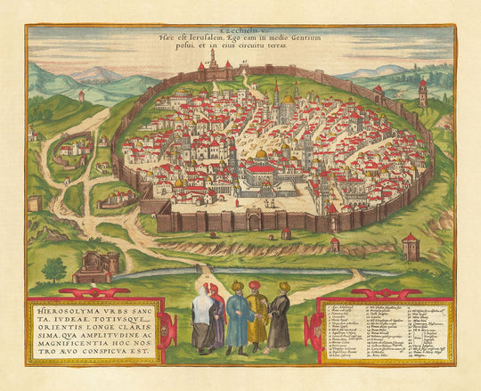 Published in 1582 by Georg Braun and Frans Hogenberg, this is the oldest full, true map of Jerusalem. If Shakespeare ever visited Jerusalem, this is what it would've looked like. This map was first published in Civitates Orbis Terrarum - the Cities of the World - which was a cartographical masterpiece featuring 546 maps.