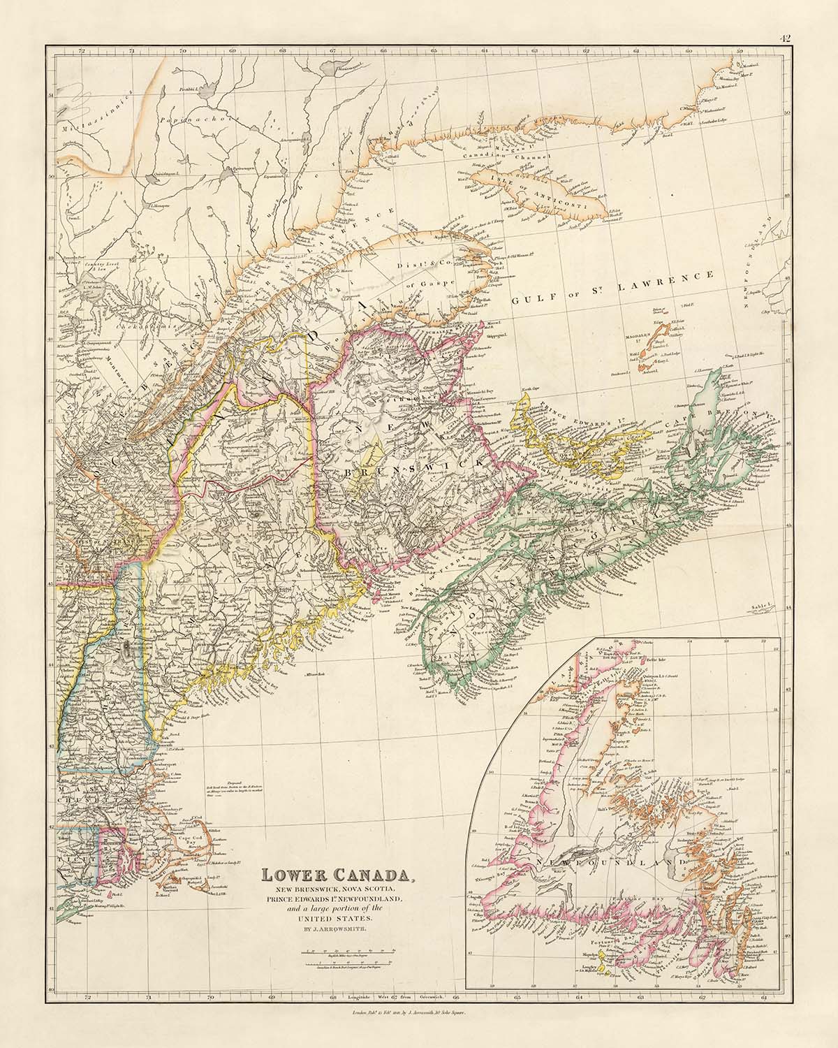 Old Map of Lower Canada by Arrowsmith, 1844: Montreal, Quebec, Newfoundland, New Brunswick, Nova Scotia