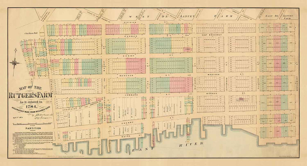 Old Map of Lower East Side & Two Bridges, NYC 1874: Manhattan Streets, Rutger's Farm, East River