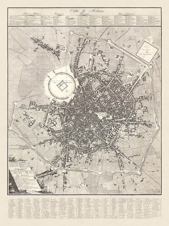 The "Città di Milano" map, meticulously crafted by Giacomo Pinchetti in 1801 and engraved by Giuseppe Caniani, is a remarkable testament to the urban and architectural grandeur of early 19th-century Milan. This exquisite map not only charts the intricate layout of Milan's streets and squares but also encapsulates the ambitious vision of the Napoleonic era, particularly through the proposed Foro Bonaparte project. This project, although never realized, envisioned a transformative urban space with a nearly square civil building at its heart, surrounded by public and private edifices, reflecting the grandiosity of Napoleonic urban planning.