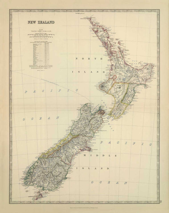 Old Map of New Zealand in 1879 by AK Johnston: Auckland, Christchurch, Wellington, Queenstown, Dunedin