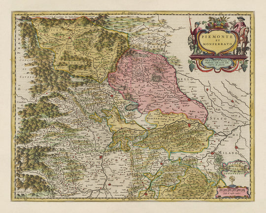 Old Map of Piedmont & Monferrato, Italy by Joan Blaeu, 1665: Turin, Alessandria, Asti, Casale Monferrato, Vercelli
