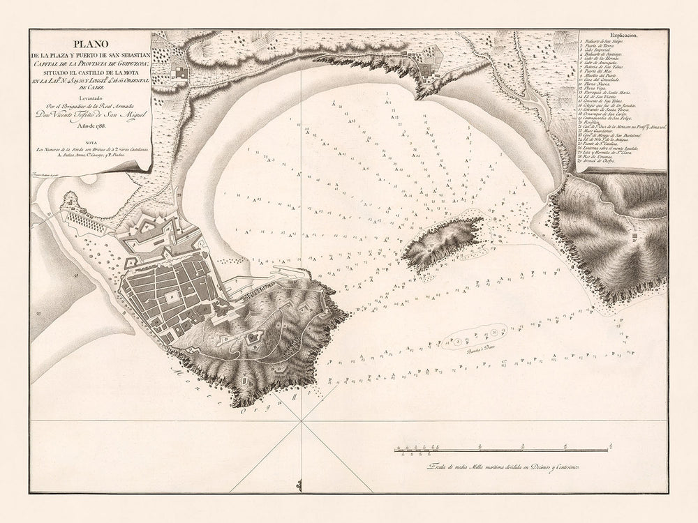 Finally, the map offers a wealth of information about the city's coastal cities, towns, and coastline detail. It provides a snapshot of the city's maritime activities, hinting at the bustling trade and the vibrant life of the harbor. The map also includes an explanation, adding another layer of understanding to the viewer. Overall, the 'Plano de la plaza y puerto de San Sebastian' is more than just a map; it is a historical document, a piece of art, and a narrative of a city's past.