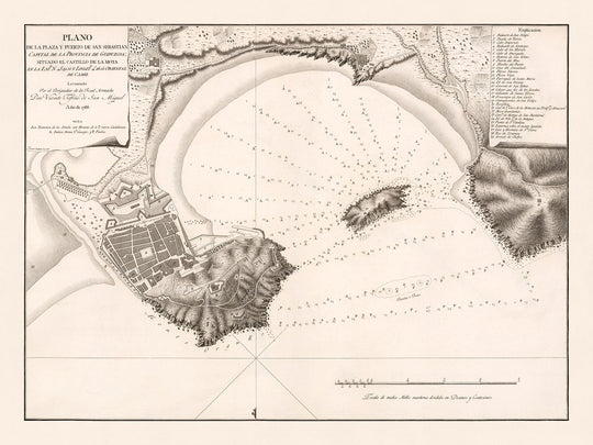 Old Map of San Sebastian, 1788: Bahía de la Concha, Plaza de la Constitución, Mount Urgull, San Telmo, Good Shepherd Cathedral